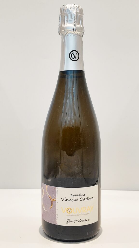 Ce Vouvray pétillant est élaboré selon la méthode traditionnelle avec seconde fermentation en bouteille. Les raisins proviennent de sols d’argile à silex sur sous-sol calcaire, vendangés manuellement en caisses. Fermentation alcoolique en cuve fibre thermorégulée. L’originalité : l’arrêt de la fermentation à 28 grammes de sucre résiduel, puis la prise de mousse se fait naturellement avec ces sucres résiduels, sans ajout de liqueur de tirage. Brut Nature, zéro dosage : seuls les sucres naturels du raisin non fermentés construisent la finale. Élevage 12 mois sur lattes avant dégorgement. La robe est jaune pâle brillante. Le nez dévoile des notes de pêche blanche, de fleurs blanches, de pomme et de poire, avec une fine touche grillée. En bouche, les bulles sont fines et persistantes, l’attaque délicate. On retrouve les arômes de fruits blancs avec des nuances d’agrumes et une finale construite sur la minéralité et une légère amertume typée. Un pétillant précis, élégant, sans lourdeur, porté par une belle fraîcheur naturelle. Vin de fête et de plaisir, accessible dès sa jeunesse.