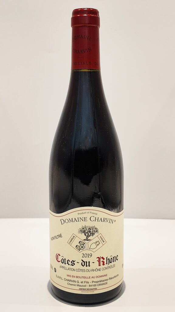 Une robe grenat intense aux reflets rouge cerise annonce un vin franc et généreux. Le nez s’ouvre sur des notes éclatantes de fruits rouges mûrs avec framboise, fraise et cerise bien juteuse, puis viennent les épices douces, une touche de poivre fraîchement moulu et ces herbes fraîches coupées qui rappellent la garrigue provençale. L’expression est pure, sans fard, directe. En bouche, l’attaque se montre ronde et gourmande, la matière se déploie avec une finesse remarquable qui signe les grands terroirs du Rhône méridional travaillés avec intelligence. Le soyeux est là, velouté, presque caressant, porté par des tanins parfaitement fondus qui enveloppent le fruit sans jamais l’écraser. La fraîcheur traverse l’ensemble et maintient cette élégance jusqu’en finale où reviennent les épices et la garrigue. C’est puissant mais fin, c’est rond mais frais, c’est un Côtes du Rhône qui joue dans la cour des grands. Les vignes âgées d’une quarantaine d’années en moyenne puisent dans des sols argilo-calcaires sableux parsemés de galets roulés, bénéficiant de cette exposition fraîche qui caractérise le nord-ouest de l’appellation. Léger foulage puis mise en cuves sans éraflage, 100% de grappes entières donc, avec des remontages quotidiens aérés qui favorisent les extractions en douceur. Les vinifications durent entre 18 et 21 jours selon les millésimes. L’élevage de 18 mois en cuve béton préserve cette fraîcheur et cette délicatesse qui font la signature Charvin. Pas de filtration, pas de collage, juste du raisin et du temps.